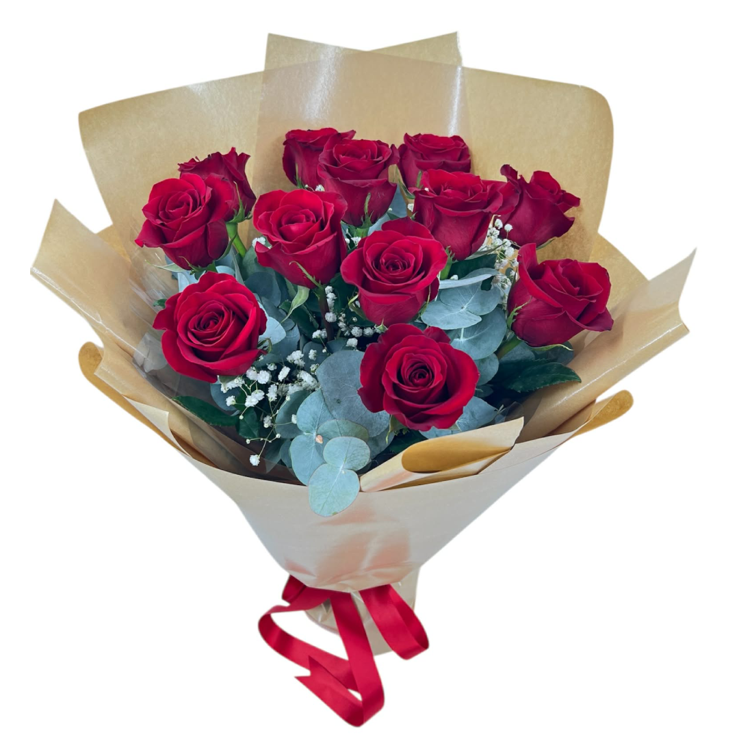Twelve Red Ecuador Roses arranged in a circular bouquet, Anna will delight a valentine heart!