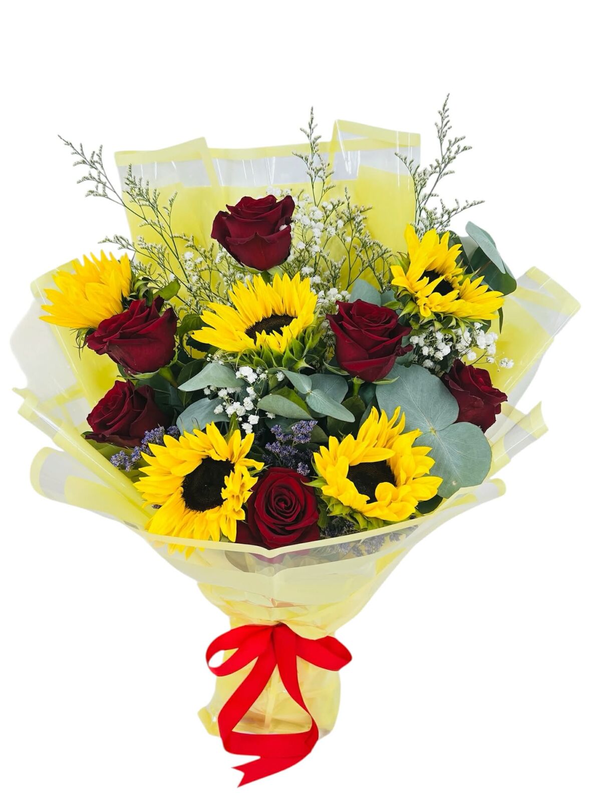 Six long-stem Ecuador roses and six sunflowers arranged in a bouquet. The Radiant Love Bouquet Love will surely brighten up your love one's day.